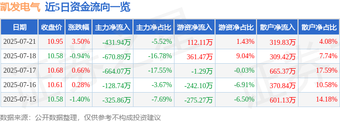 股票行情快报:凯发电气(300407)7月21日主力资金净卖